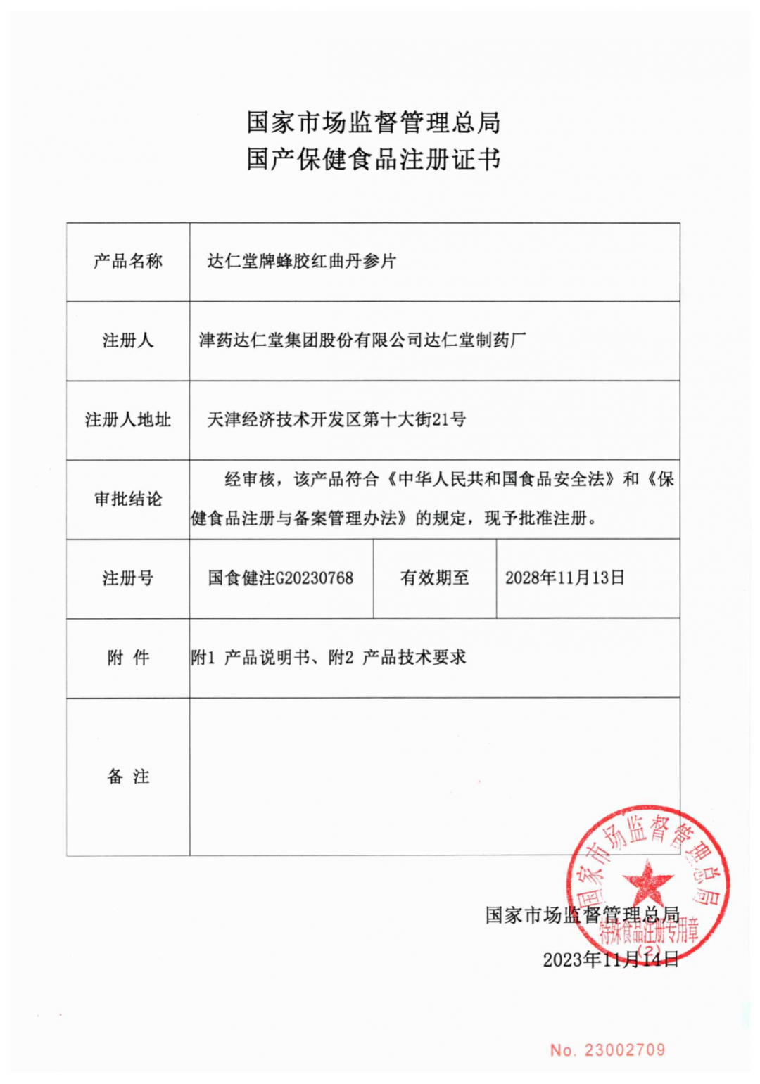 近期,津药达仁堂集团达仁堂制药厂两款保健食品凭借其优质的产品质量成功取得达仁堂牌阿胶牡蛎骨碎补片和达仁堂牌蜂胶红曲丹参片国产保健食品注册两项证书。该证书的取得对达仁堂制药厂来说具有重要意义,标志着企业在保健食品领域取得了新的进展和突破。